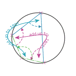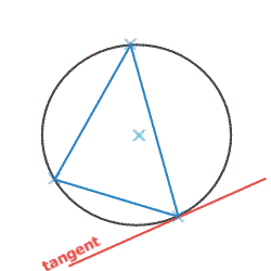 Rule 7: Triangle meets TangentCalled the Triangle Tangent Theorem (or the Alternate Segment Theorem)When a triangle (with all three vertices on the circumference) meets a tangent; the opposite angles will be equal:
