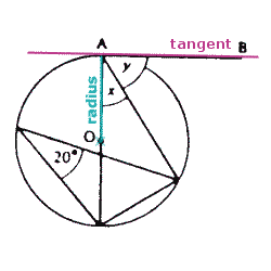 angle OAB = 90° so angle y = ...° Note: At each stage you must state a reason (in words) for your answer