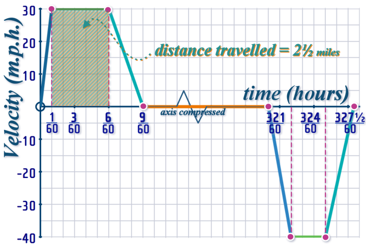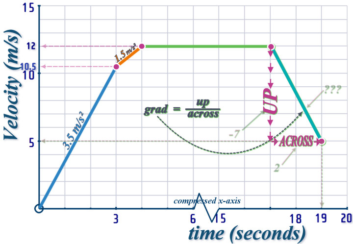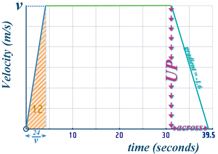 ┌──────┴─────────────────────┐ │Since we know this continues│ │until speed drops to 20 m/s:│ ├────────────────────────────┤ │ grad = up │ │ across │ │ │ │ -4 = -20 │ │ across │ │ │ │ => across = 5 │ └────────────────────────────┘ |