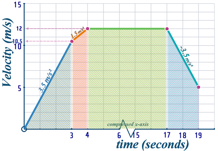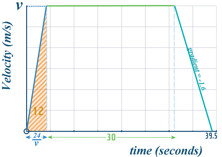 After that, we know Pranjal cycles at steady speed for \(30\) seconds and then decelerates at \(1.6\) m/s˛: