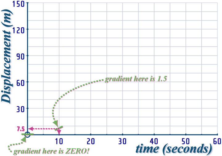 This section of the displacement-time graph is curved; with an DECREASING GRADIENT over the interval \(t=9\) to \(t=10\)
