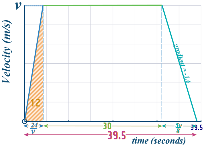 ...on the v-t graph, this is represented with a straight line, \(gradient\,=\,-\frac{3}{2}a\), \(UP=-v\), \(across=???\)