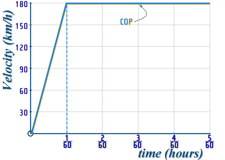 So, we know that he reaches a top speed of \(180\) km/h, then goes at steady speed: