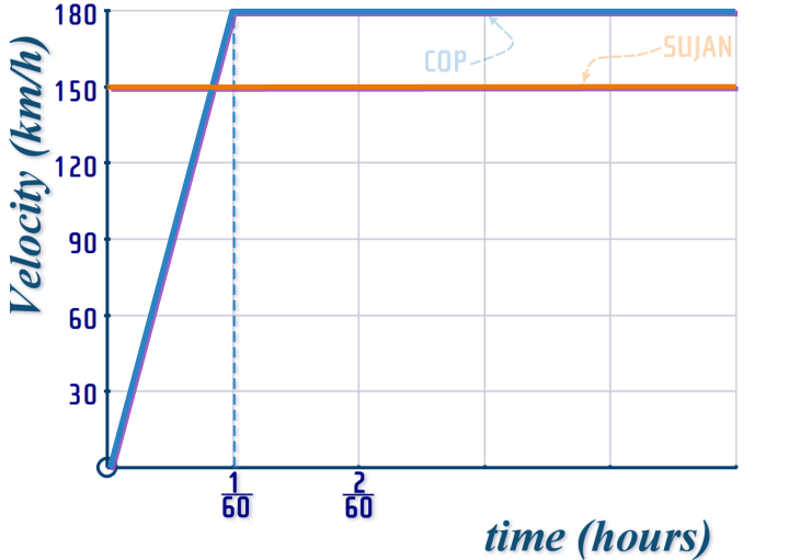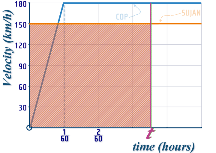 Don't think the point where the orange line intersects the blue line is of particular importance: That's just the point where the COP reaches the same speed as SUJAN - he's still far behind, but from then on, he'll start to reel him in...