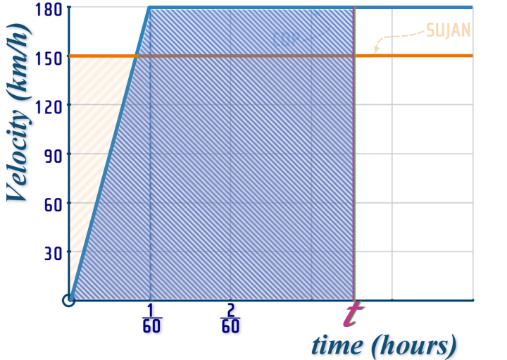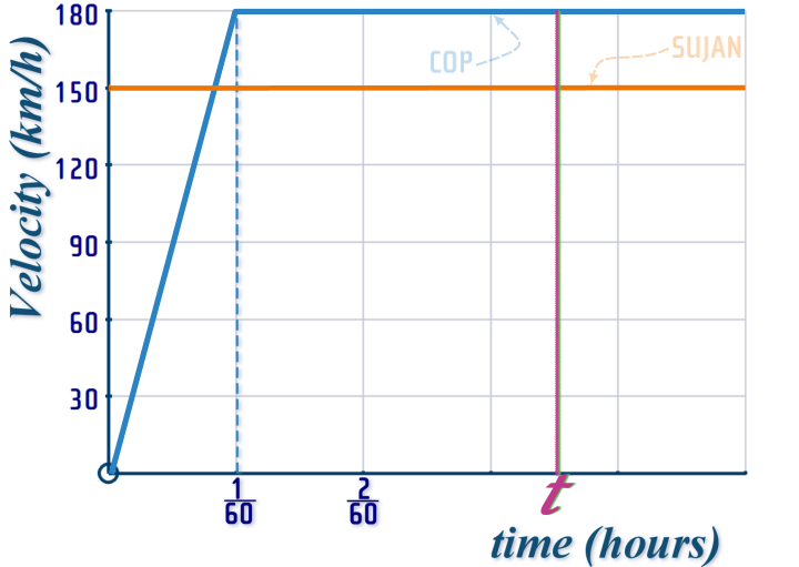 To find the time when the COP CATCHES SUJAN: Add a vertical line to your grid (at time \(t\)) - representing the time when the cop catches Sujan: