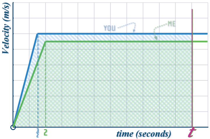 But our axes at \(t\) and \(V\), so the \(20\) m head-start makes no difference to either of those (i.e. it makes no difference to the graph!)
