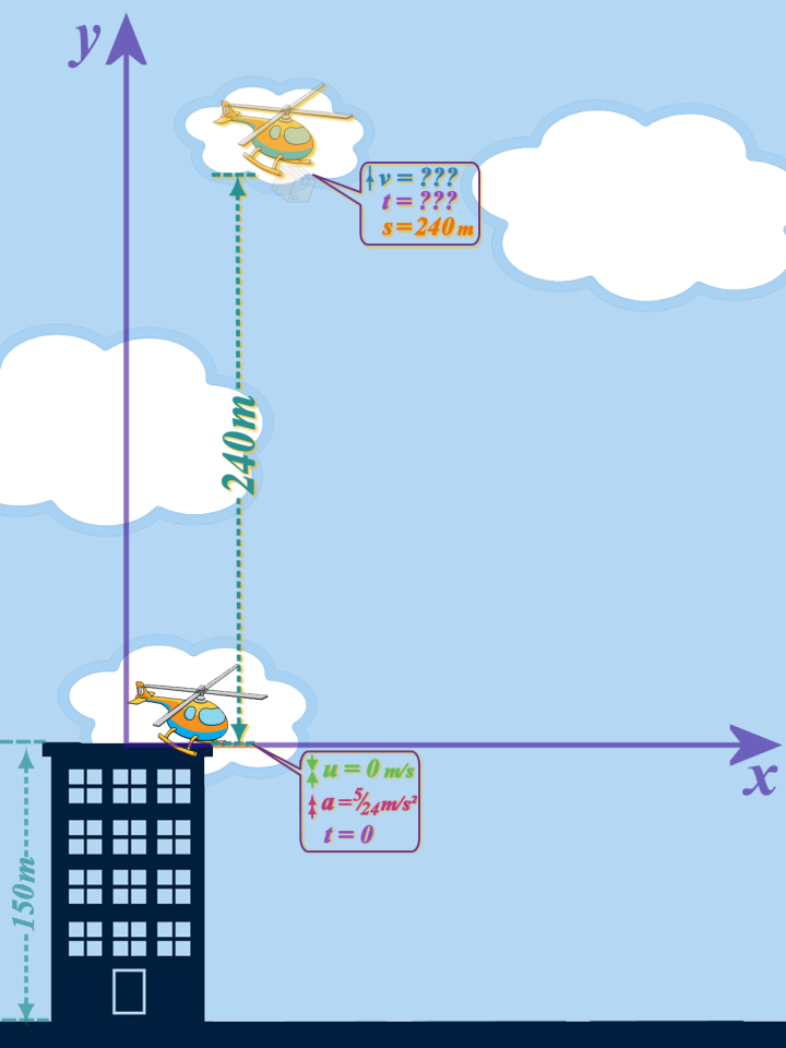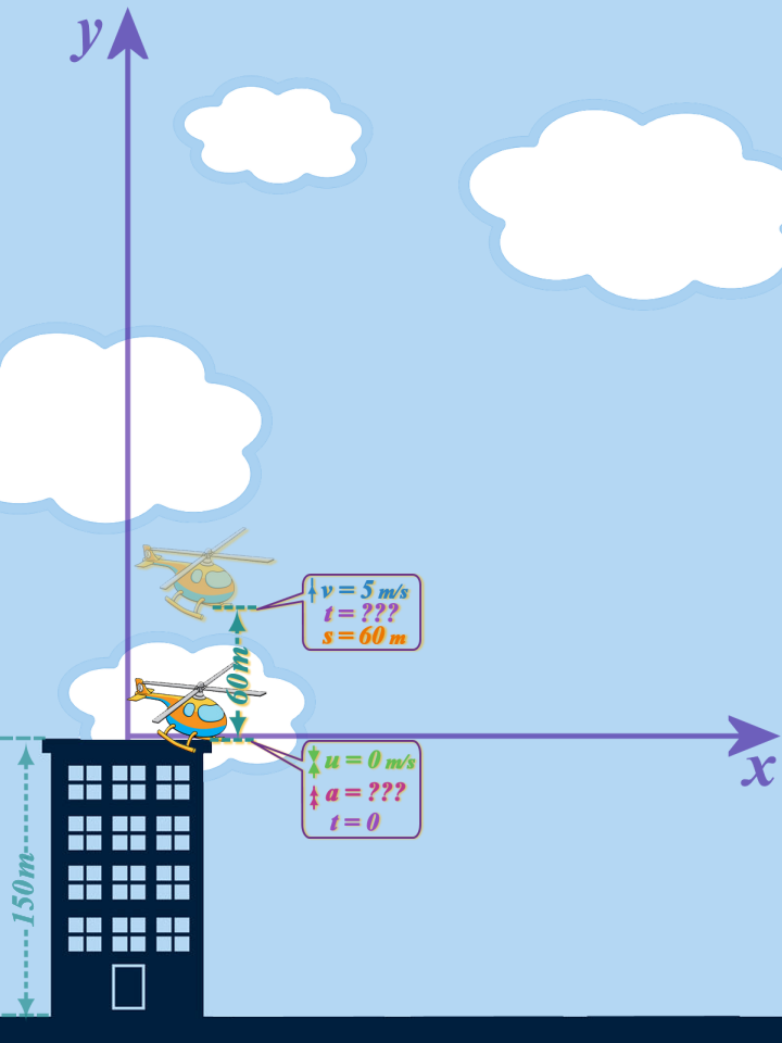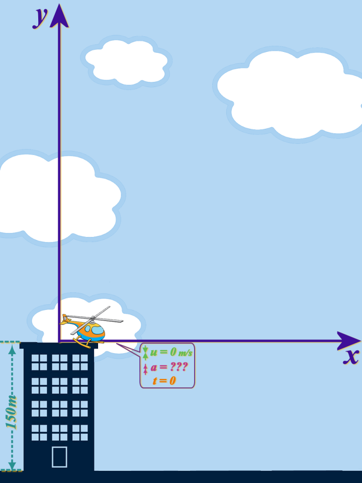 So, to start with, the helicopter is AT REST on the top of the 150 m high building and it is going to take off with a vertical acceleration of \(a\) m/s2 (i.e. we don't know the acceleration)...