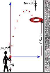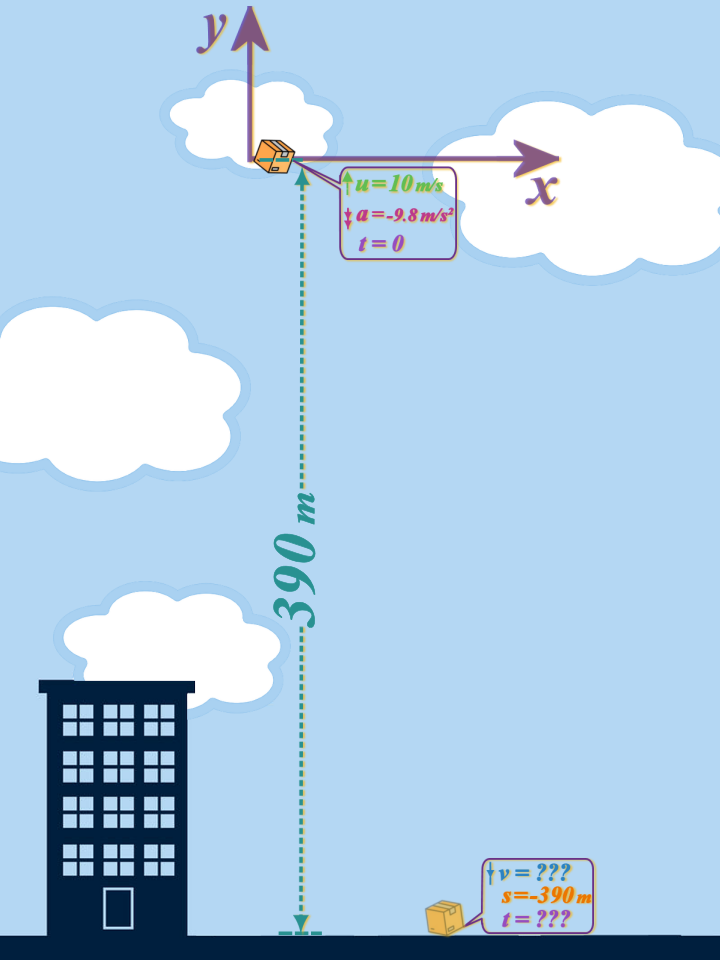 \(\left. \begin{array}{r} u=+10\\ \cancel{v=?}\\ a=-9.8\\ t=?\\ s=-390\\ \end{array} \right\} \,\,s=ut+\frac{1}{2}at^2\)