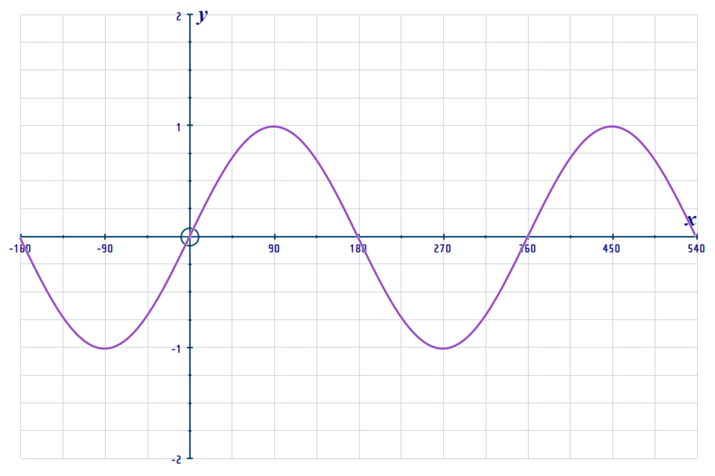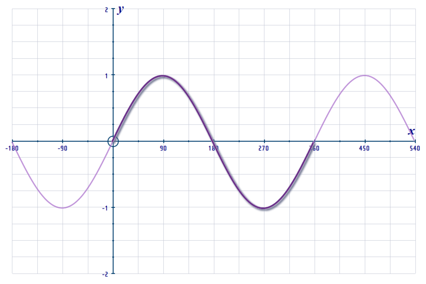 1-cycle of the y = sin x graph has roots at (0, 0), (180, 0) and (360, 0);